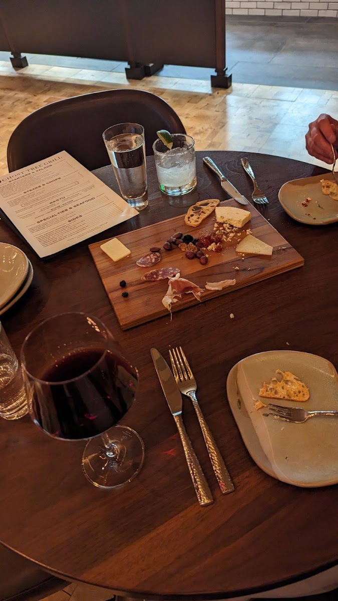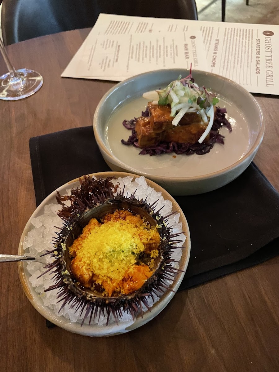 “ Like the other review says, it sets the bar high. From the aesthetics of the dining room, bar and open kitchen, Ghost Tree Grill is amazing. The high ceilings and natural wood make for a warm welcoming atmosphere. We sat in the bar at a high top. Our servers were top notch and explained everything on the menu. We only had appetizers, but the dinners that were carried by looked amazing. We started with the charcuterie board and the ahi tuna Crudo. Both were excellent. The charcuterie board as NW and local ingredients. Both were awesome. The tuna a cold and delicate and the charcuterie board was warming. Next we had the pork belly and local purple uni. I’ll go back the uni any time any day! 6 stars! It was super cold, presented amazingly and the dish was the hit of the night. The pork belly was perfectly cooked. The mustard bbq sauce was a bit powerful, but combined with our left over charcuterie board Rogue Smokey Blue cheese it was still excellent (not all pallets are the same). We finished with the tres-leches German chocolate cake, sorbet and an espresso. Like everything else they were amazing. Cold where it should be and warm where it should be. No sugar or cream were needed for the espresso. It was perfect We will be back, but the next visit will be during daylight to see and enjoy the views of Old Macdonald and the Ghost Tree. ”