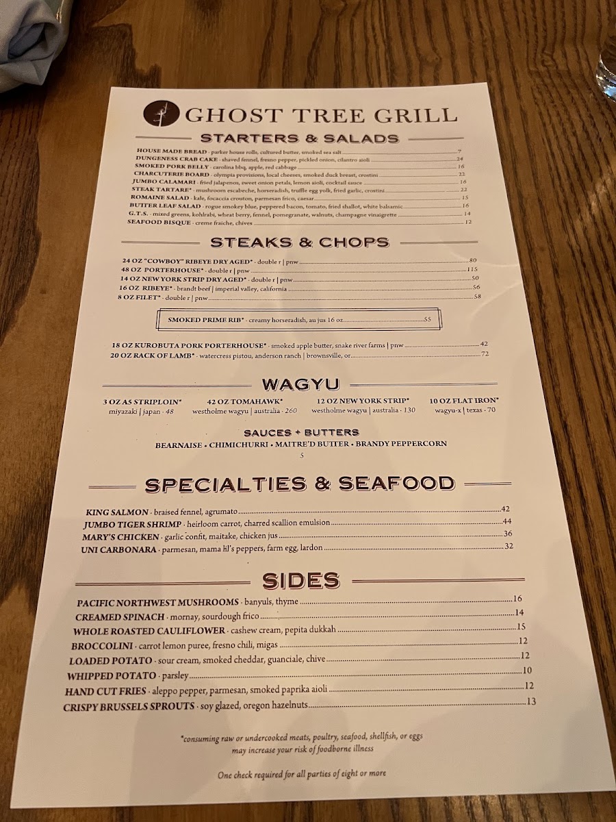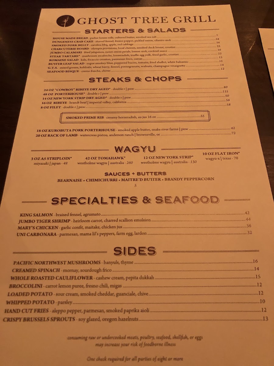 The menu at Ghost Tree Grill, located at 57744 Round Lk Rd, Bandon, OR, is a remarkable showcase of premium cuts, elevated seafood, and bold culinary craftsmanship. The dining experience begins with enticing Starters & Salads, including House Made Bread, the rich and savory Dungeness Crab Cake, and indulgent bites like Smoked Pork Belly and Jumbo Calamari. For those looking to share, the Charcuterie Board is an excellent opener.
