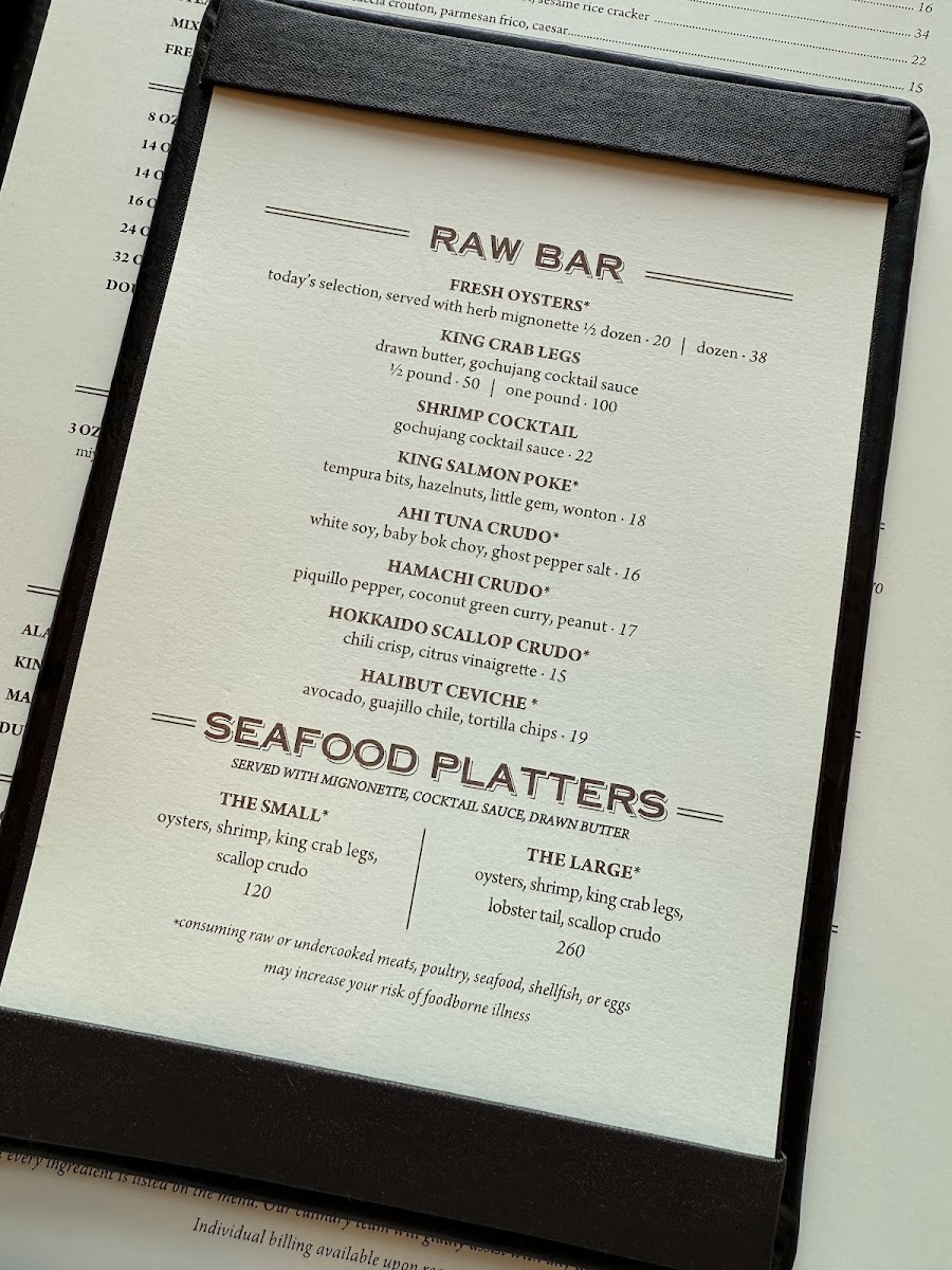Seafood lovers are treated to a refined Raw Bar featuring Fresh Oysters, King Crab Legs, Shrimp Cocktail, King Salmon Poke, and Ahi Tuna Crudo. For those looking to indulge in variety, the Seafood Platters-The Small and The Large-deliver a curated oceanic feast.